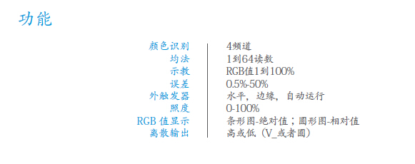 顏色傳感器Colormax FLEX 提供了4種程序的色彩識(shí)別頻道,配有PNP/NPN輸出程序,紅色,綠色以及藍(lán)色模擬輸出程序,序列數(shù)據(jù)輸出程序以及高端通訊協(xié)議,以整合到你的控制系統(tǒng)。