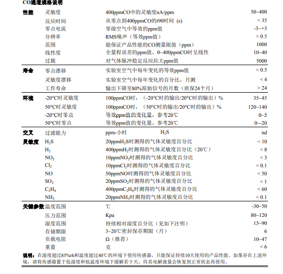 三、COH-A2 一氧化碳傳感器的通道技術(shù)指標(biāo):