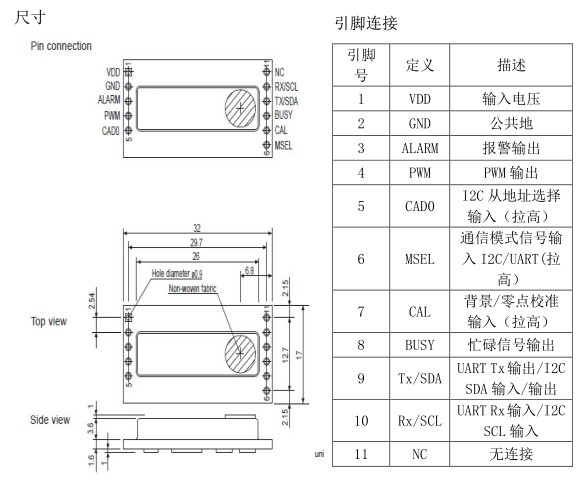 五、CDM7160紅外二氧化碳傳感器(NDIR CO2傳感器) 尺寸: