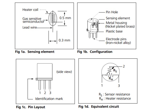 氣體感應半導體材料是小珠子的類型, 加熱線圈和電極線嵌入在元件中。 敏感元件安裝在有5 個可以通氣的小孔的金屬盒內(Fig1) 。