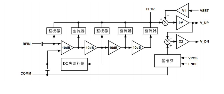 無線射頻檢測(cè)芯片 - MS2351M是一款對(duì)數(shù)放大器芯片,主要用于接收信號(hào)強(qiáng)度指示RSSI與功率放大器控制,工作頻率范圍是100M~2500MHz,典型動(dòng)態(tài)范圍45dB。各種手持設(shè)備和其它無線設(shè)備都可使用該芯片。相對(duì)于使用離散的二極管檢波器,MS2351M可以提供更寬的動(dòng)態(tài)范圍更高的精度。特別地,在-40℃~85℃溫度范圍內(nèi)表現(xiàn)出良好的溫度穩(wěn)定性。MS2351M本質(zhì)上是電壓響應(yīng)器件,典型的輸入信號(hào)范圍均方根值1.25mV~224mV,或-58dBV~-13dBV,這與負(fù)載為 50Ω時(shí)-45dBm~0dBm等效。為方便應(yīng)用,內(nèi)部使用AC耦合。MS2351M提供兩種電壓輸出。第一種從引腳V_UP輸出,隨著輸入信號(hào)從-45dBm增大到0dBm,該引腳輸出從0到1.2V,這時(shí)的輸出可工作在測(cè)量模式。第二種從引腳V_DN輸出,它是V_UP電壓的反相,且有2倍的增益。假設(shè)供電電壓大于3.3V,那么隨著輸入信號(hào)由最小到最大,V_DN輸出從2.25V降到接近于地電位。該輸出可以使芯片工作在控制模式。這種應(yīng)用需外部給VSET 引腳一個(gè)電壓,然后V_DN就可以控制VGA或功率放大器。詳細(xì)信息請(qǐng)參考應(yīng)用部分。