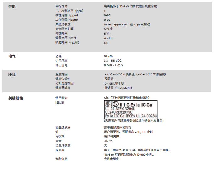 英國Alphasense VOC 光電離子傳感器 高級(jí)PID傳感器 – PIDX-A-020 參數(shù):