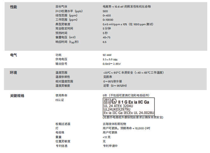英國Alphasense VOC 光電離子傳感器 高級PID傳感器(0-10000ppm)– PIDX-A-10K參數(shù):