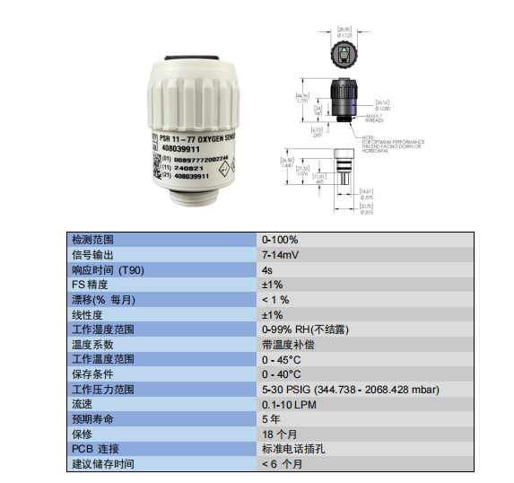 美國AII O2 氧氣傳感器 PSR-11-77  參數(shù):