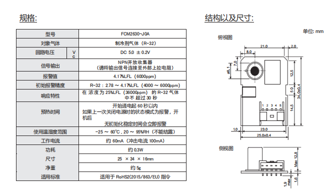日本Figaro 用于制冷劑氣體R-32 的預校準模塊 FCM2630-J0A 參數(shù):