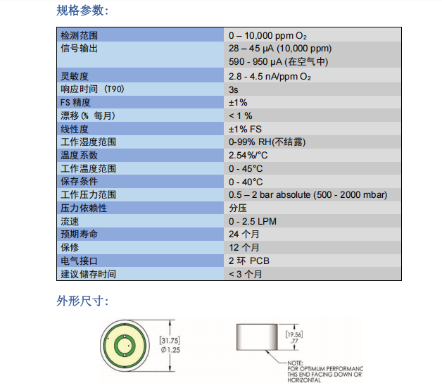 美國AII PPM級 電化學(xué)微量氧傳感器 O2 氧氣傳感器?GPR-12-333 參數(shù):