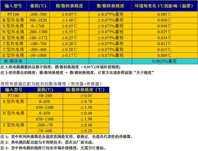 輸入類型:2/3/4線制PT100/PT1000和鎢錸/B/R/S/N/K/J/T/E型熱電偶